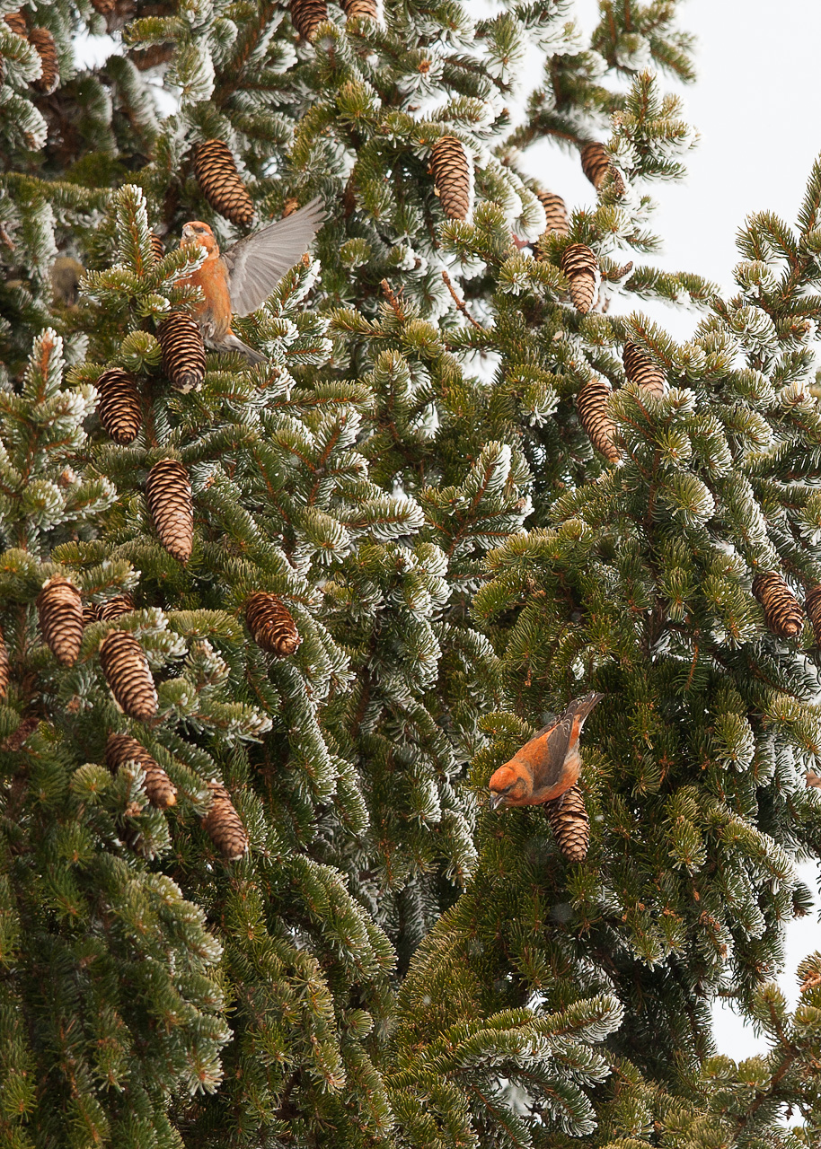 Snow made focusing a bit difficult and thus requiring a smaller aperture. All photos in this blog post are shot with the 1d mark III and the 300 f/2.8 IS. Red crossbills where fighting for cones 30 feet up in old spruces. Not an ideal situation for photography and these are the best shotsI got.